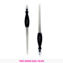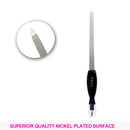 Vega nail file having two-sided nickel plated surface for smooth, gentle filling of nails and cuticle trimmer to trim the dead skin along the nails with outward strokes.