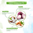 - Reduces hair fall: Onion oil stimulates the scalp, promotes blood circulation, and reduces itch and irritation. It deeply penetrates the scalp and hair follicles, helping in hair growth. Coconut also prevents hair loss and promotes healthy hair growth. Rich in omega 3 fatty acid and vitamins, almond oil strengthens hair and treats hair loss.