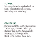 Surajmukhi tail (Helianthus annuus oil), Kusumbhi tail (Carthamus tinctorious oil), Sarsoan tail (Brassica nigra oil), Badam tail (Prunus amygdalus oil), Jatamansi (Nardostachys jatamansi), Ashwagandha (Withania somnifera), Lotion base Q.S.