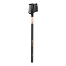- Two sided eyebrow brush that features a comb on one side and a bristled brush on the other