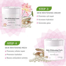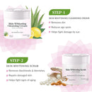 The Skin Whitening Scrub contains amino acids, minerals, antioxidants, Vitamin C & E from lemon and almonds to deeply exfoliate the skin and remove dead cells. Skin Whitening Pack contains amino acids, minerals & calcium from pearl powder. It helps promote cellular repair and hydration.