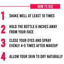 - As the final step in your makeup, hold the bottle 6 inches away from your face and spray 5-6 times to evenly cover the face
