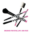 - Includes a blush brush, eye groomer, eye applicator, eyeshadow and lip brush