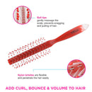 - Round brush gives quick curl, adds volume and smoothens the hair shaft