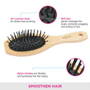 - Wooden bamboo cushioned brush effortlessly de-tangles curly hair